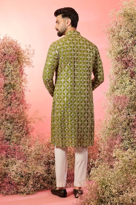 Signature lime green kurta featuring intricate zari work and mirror embellishments