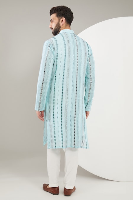 Blue kurta featuring mirror and thread embroidery in stripe pattern. Paired with matching pant.