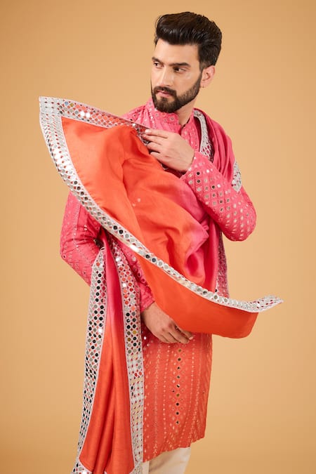 Pink ombre straight kurta featuring mirror and thread embroidery. Paired with a matching stole for added elegance.