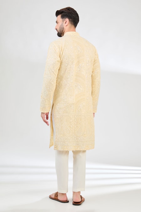Yellow kurta featuring full sleeves and band collar with intricate paisley garden embroidery