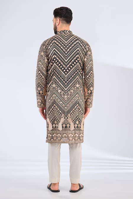 Black georgette kurta featuring intricate peacock motif embroidery and a band collar