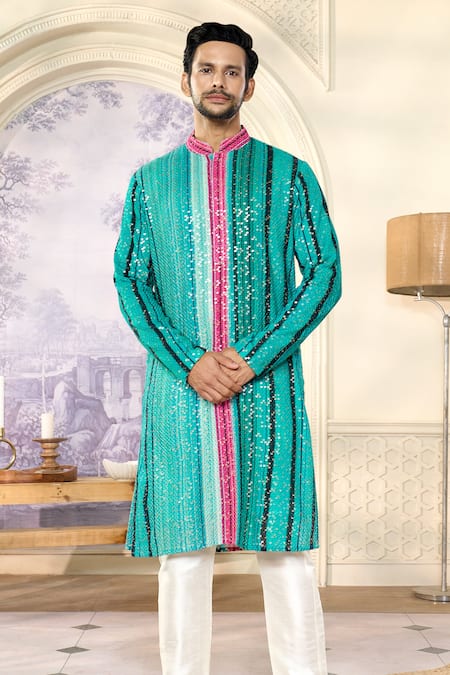 Blue kurta featuring full sleeves and mandarin collar, crafted in georgette with sequin striped embroidery. Paired with a matching pant for a complete look.