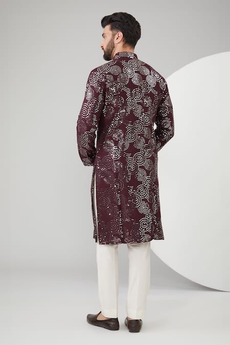 Wine georgette kurta featuring full sleeves, mandarin collar, and intricate sequins and thread embroidery. Paired with matching pant for a complete look.