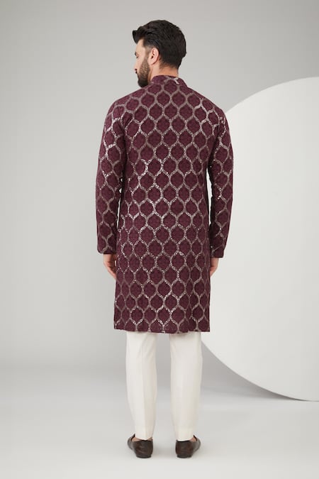 Wine georgette kurta featuring chikankari, sequins, and thread embroidery. Paired with a matching pant.