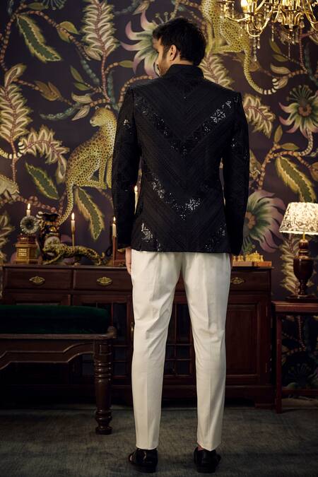 Black silk sherwani featuring full sleeves, band collar, and intricate sequins and thread embroidery