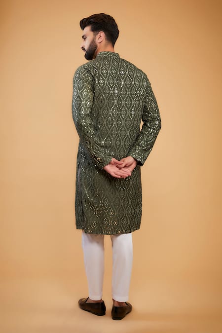 Military green silk kurta featuring intricate mirror and thread work embroidery