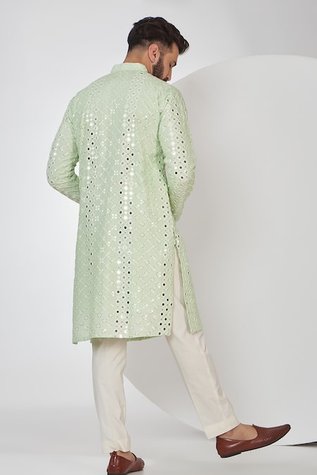 Pastel green silk kurta featuring mirror, thread, and foil embroidery. Paired with matching pants for a complete look.