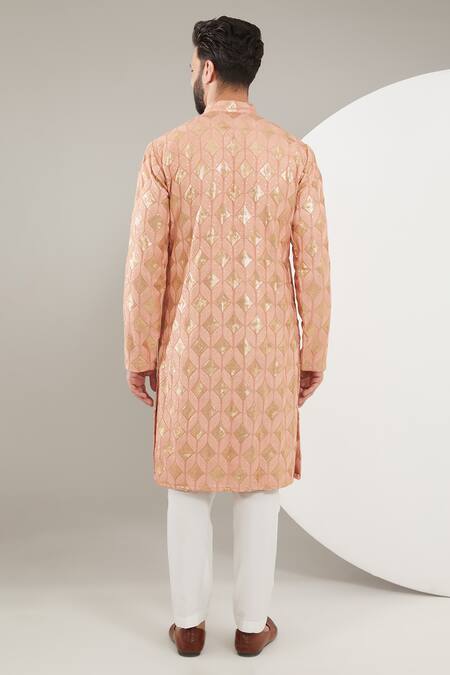 Peach kurta featuring thread and sequin embroidery in a geometric pattern on a silk base. Paired with a matching pant for a complete look.