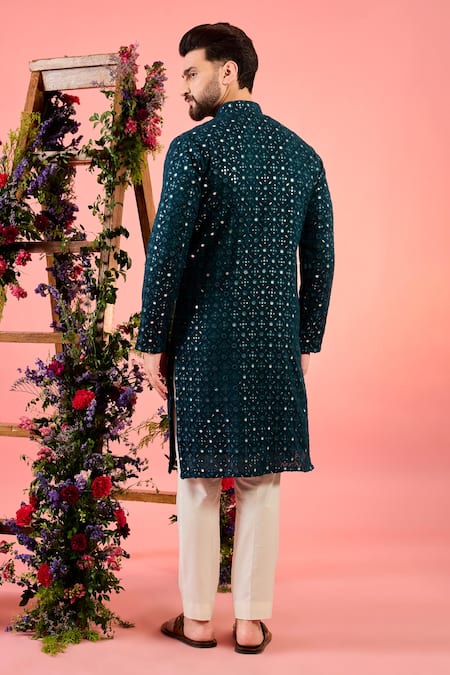 Teal kurta featuring intricate mirror work details