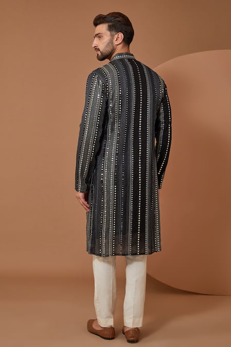 Black georgette kurta featuring thread and mirror embroidery with a mandarin collar. Paired with matching pant for a complete look.