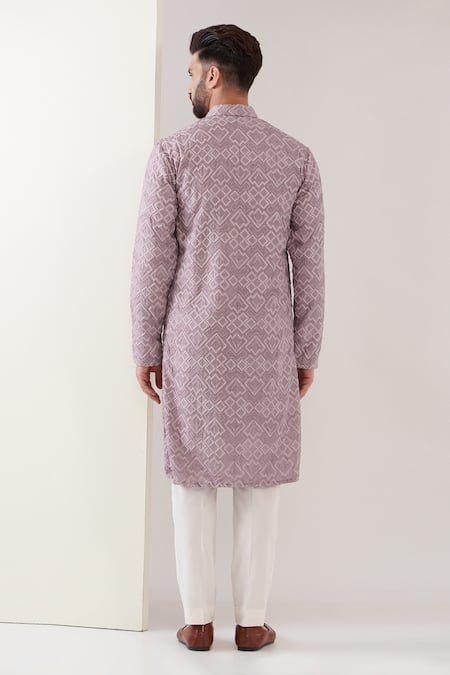 Purple silk kurta featuring a mandarin collar, full sleeves, and all-over geometric pattern with tonal chikankari thread embroidery. Paired with a contrast pant, this set is designed for comfort with side slits on the kurta.