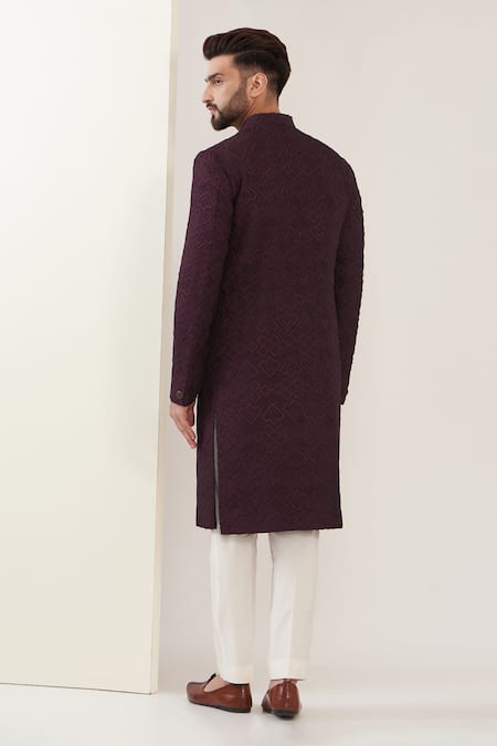 Wine silk sherwani featuring a mandarin collar, full sleeves, and a front button placket. Paired with a contrast pant, the sherwani has all-over geometric pattern and tonal chikankari thread embroidery.