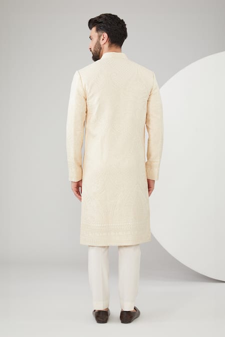 Beige silk sherwani featuring intricate thread and kalamkari kashmiri embroidery. Paired with a matching pant that is not included in the sale.