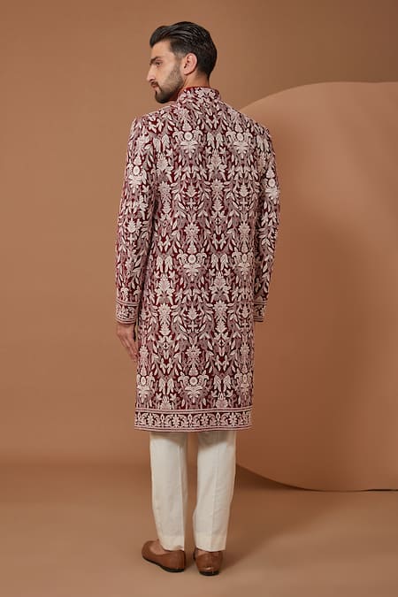 Maroon velvet sherwani featuring intricate white thread embroidery. Paired with matching pant for a complete look.