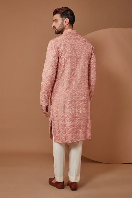 Peach silk kurta featuring thread embroidered geometric patterns. Paired with matching pants.