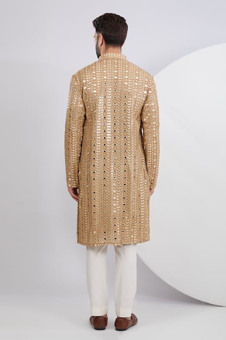 Beige kurta featuring threadwork foliage and stripe motifs, embellished with mirrorwork. Paired with coordinating pant for a complete look.