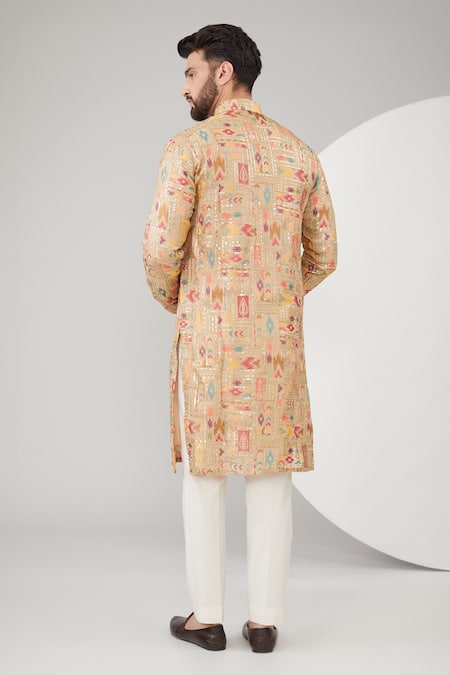 Beige kurta in georgette fabric featuring intricate zari embroidery. Paired with matching pants to complete the ensemble.
