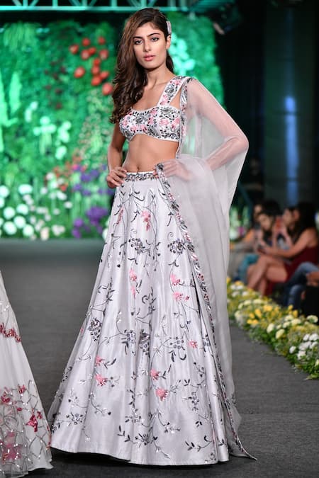 This exquisite organza comes with a raw silk blouse, replete with beautiful aari work. The light grey lehenga set comes with a dupatta showcasing embroidered borders.