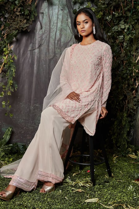Powder pink georgette kurta featuring round neckline, sheer sleeves, and hand embroidery with cutdana and tikki work. Paired with coordinating pant and net dupatta with embroidered borders.