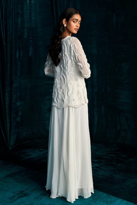 Ivory Organza, Georgette Pearls, Beads, Floral Work Kurta Sharara Set