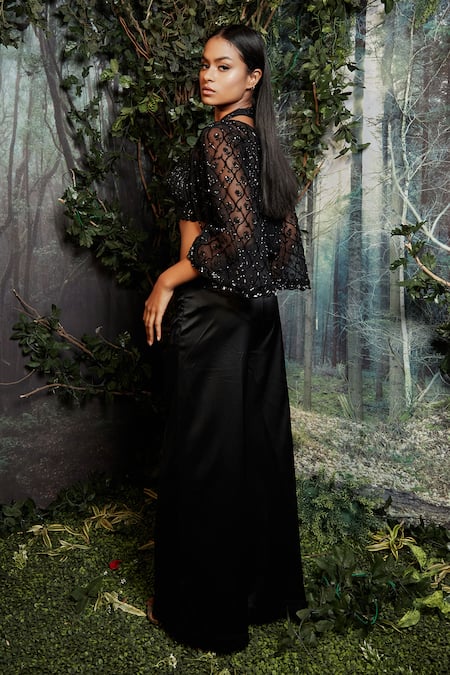 Black bustier featuring a halter neckline and sleeveless design, paired with a sheer-sleeved cape. The set includes pants with an embroidered waistband and is crafted from organza and Turkish satin.