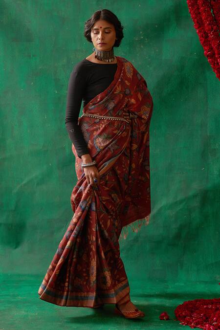Maroon kalamkari pure banarasi tussar silk saree with naturally dyed & hand-painted floral motifs. It has fringe pallu & contrast border.