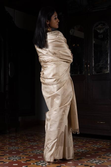 Beige pure silk saree with geometric woven motifs on the border. Comes with unstitched blouse fabric.