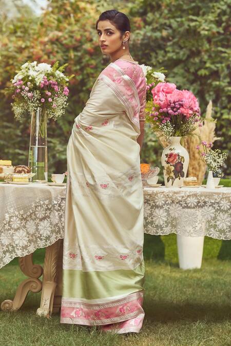Buy_Kasturi Kundal_Ivory Silk Lady Chatterley Handloom Saree With Unstitched Blouse Piece_Online_at_Aza_Fashions