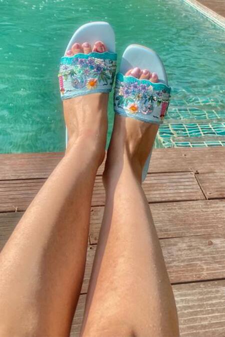 Blue leather sliders featuring an open toe design with intricate lake and swan patterns