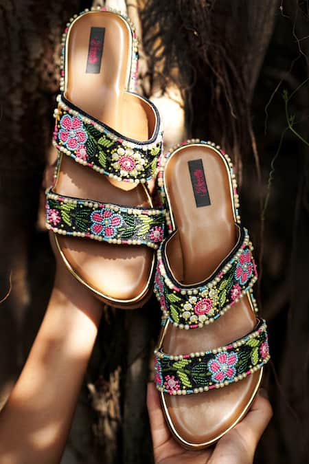 Multicolor platform wedges featuring bead and cutdana embroidery in a blossom pattern