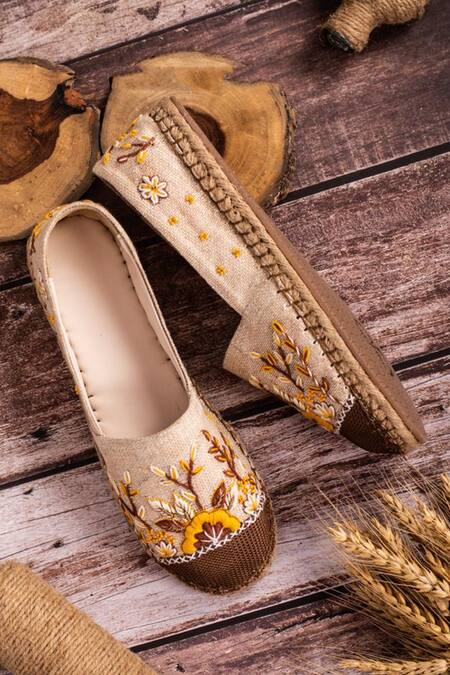 Intricate floral embroidery in warm hues, Jute-textured toe detail, Rustic appeal