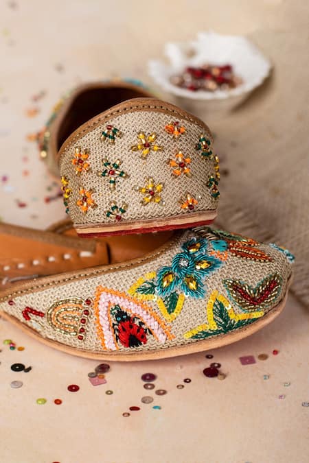 Multi color leather juttis featuring a closed shoe pattern with intricate floral and bee embroidery
