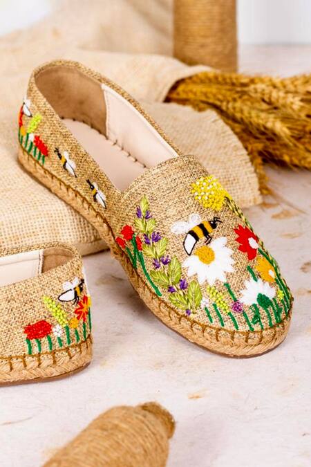 Vibrant floral embroidery with bees, Bead embellishments for added charm, Cushioned insole for comfort
