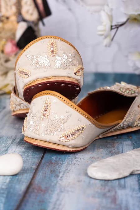 Beige handcrafted juttis featuring delicate pearl, sequin, and bead embellishments