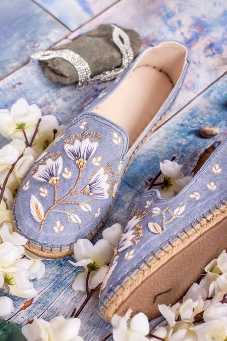 Blue espadrilles featuring intricate floral embroidery on soft denim fabric
