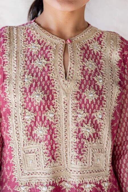 Dusty pink kurta with kathiawadi embroidery work with an asymmetric hem.