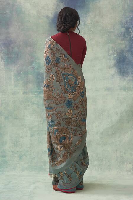 Buy_Kasturi Kundal_Blue Pure Banarasi Silk Floral Kaumudi Kalamkari Kanjivaram Saree_at_Aza_Fashions