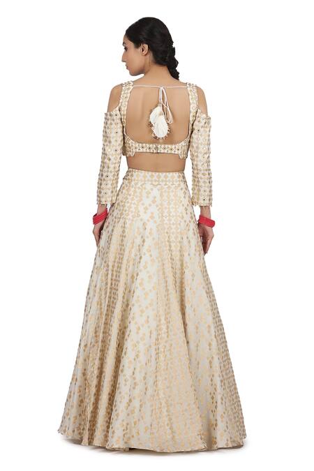 Ivory lehenga with all-over faridkot print and tie up at the waist. Comes with cold shoulder blouse and dupatta.