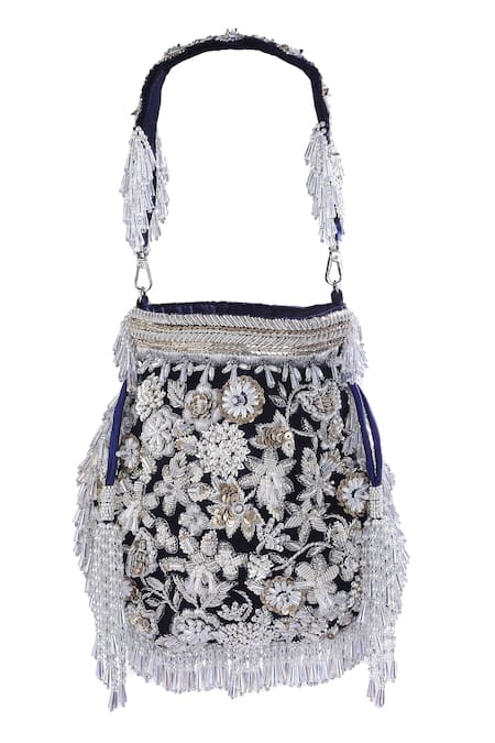 Blue velvet potli featuring floral, beads, crystal, dabka and swarovski hand embroidery. Comes with a detachable handle for versatility.