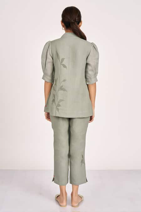 Green Linen Embroidery V-neck 3d Lily Bloom Applique Top