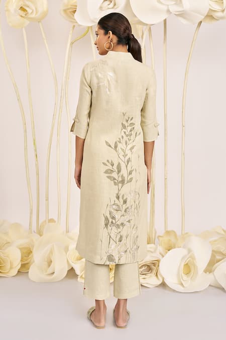 Green 100% Linen Printed And Embroidered Foil Bamboo Grove Kurta
