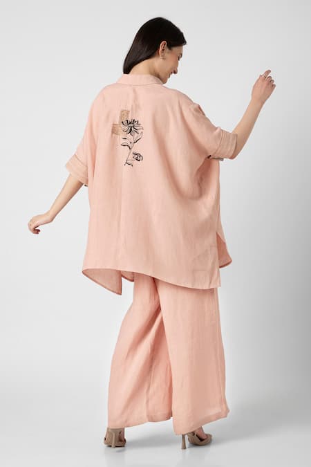 Pink collared top featuring three-quarter sleeves and intricate thread and zardosi embroidery. Paired with matching relaxed-fit pants made from 100% linen.