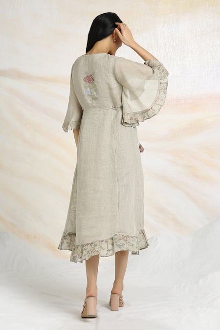 Beige Linen Tassels Round Neck Bed Of Roses Embroidered Dress