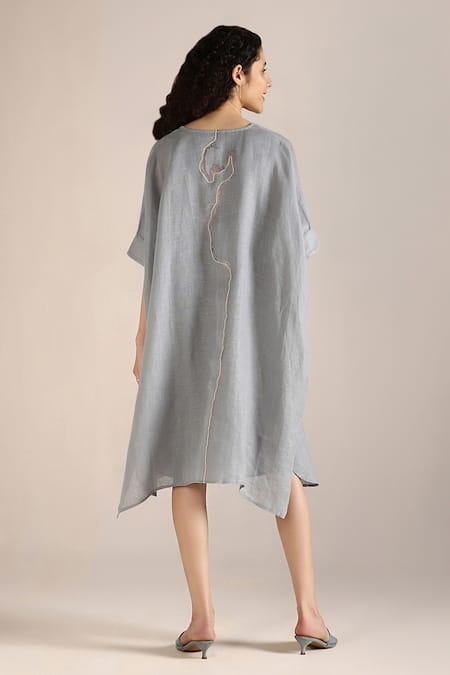 Blue Linen Embroidery V-neck Body Print Asymmetric Dress