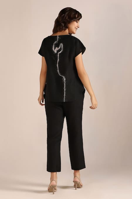 Black linen top featuring a round neckline and half sleeves with an asymmetric print