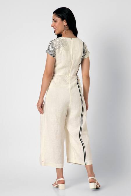 Off White Linen V-neck Brick Placement Print Jumpsuit
