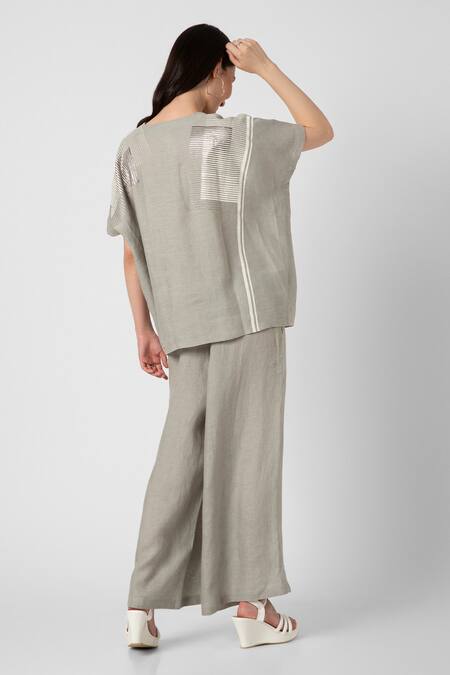 Grey 100% Linen Printed Brick V Neck Placement Top And Pant Set