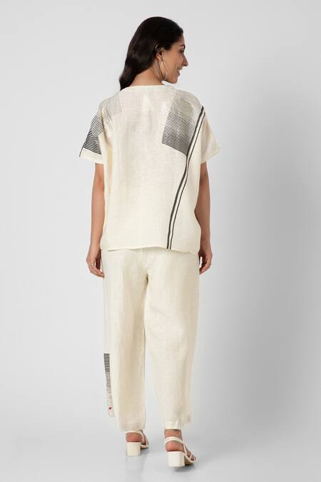 Off White 100% Linen Printed Brick V Neck Top And Pant Set
