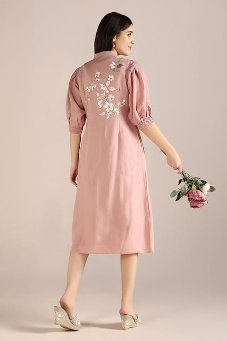 Pink Linen Embroidery Square Neck Camelia Floral Pattern Dress