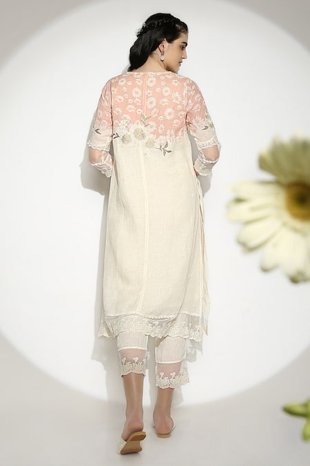 Embroidered off white and blush pink tunic featuring hand-embroidered anchor and silk threads on screen-printed daisy flowers. Paired with pants adorned with scallop embroidered lace.